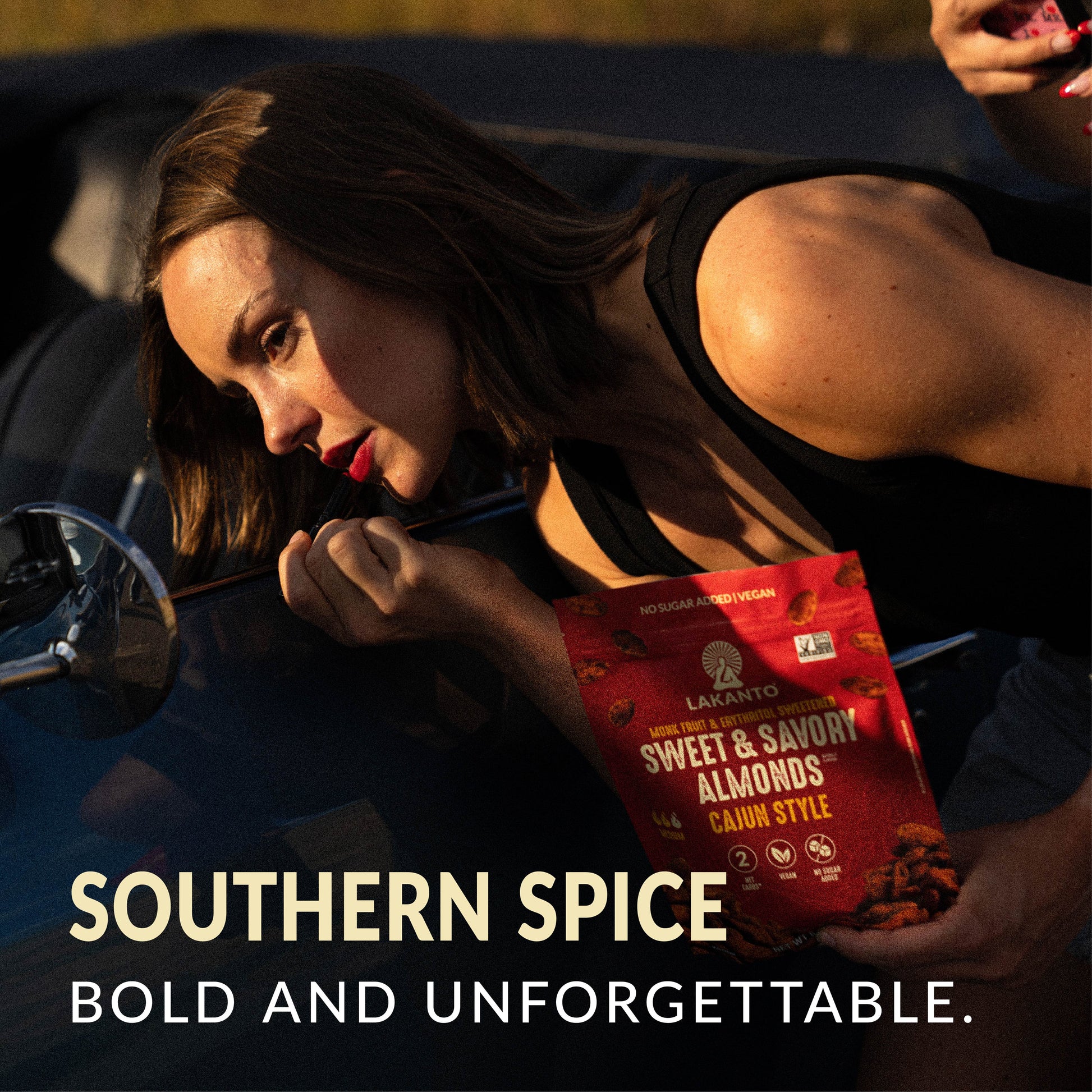 - Bold Cajun Flavor: Snack smarter with Lakanto Sweet & Savory Cajun Almonds. These crunchy almonds are coated in a perfectly balanced blend of smoky, spicy Cajun seasoning for a bold kick of flavor without added sugar.