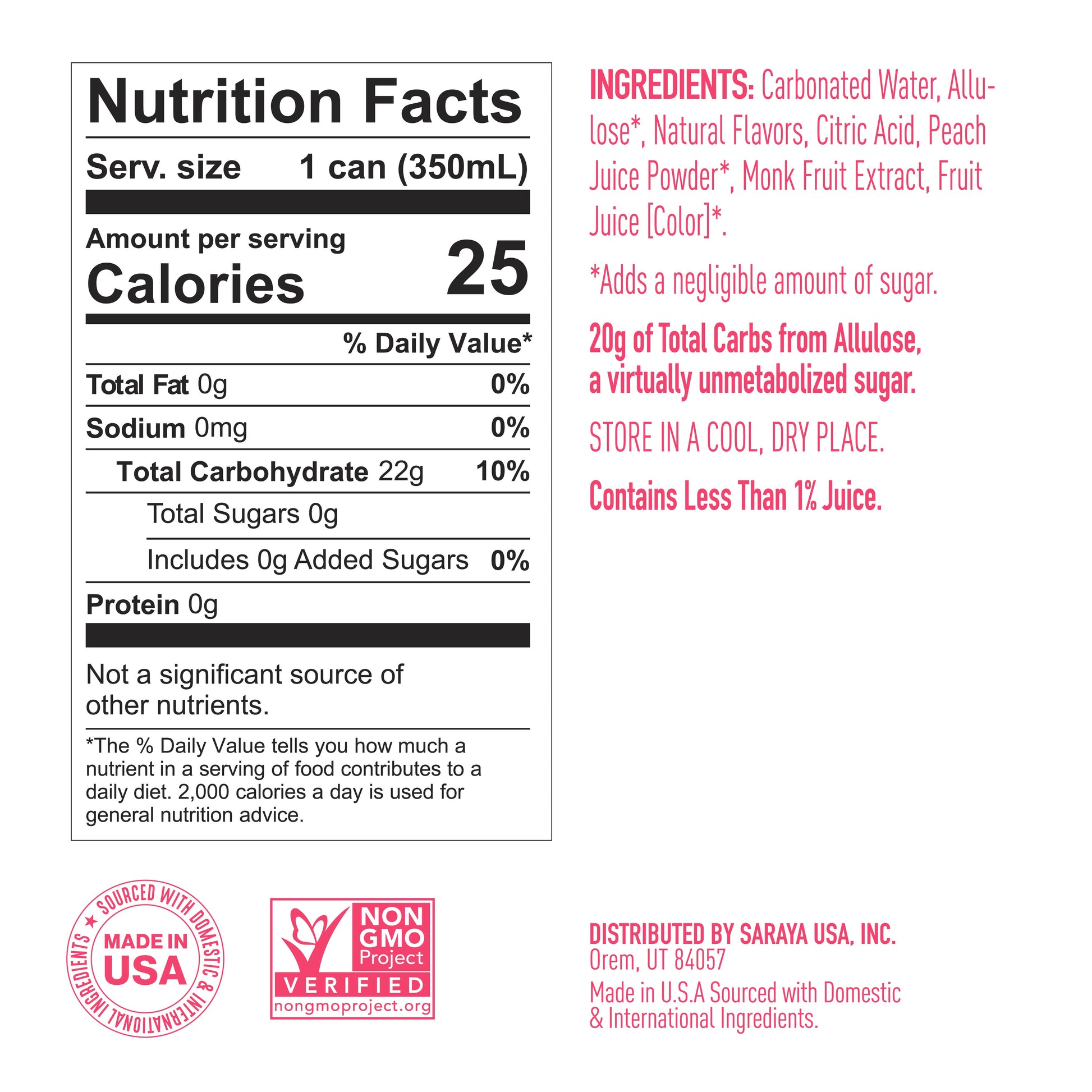 Carbonated Water, Allulose*, Natural Flavors, Citric Acid, Peach Juice Powder*, Monk Fruit Extract, Fruit Juice [Color]*