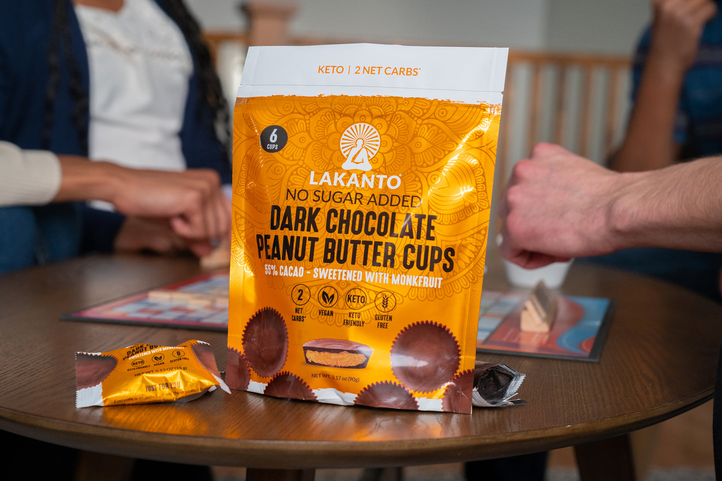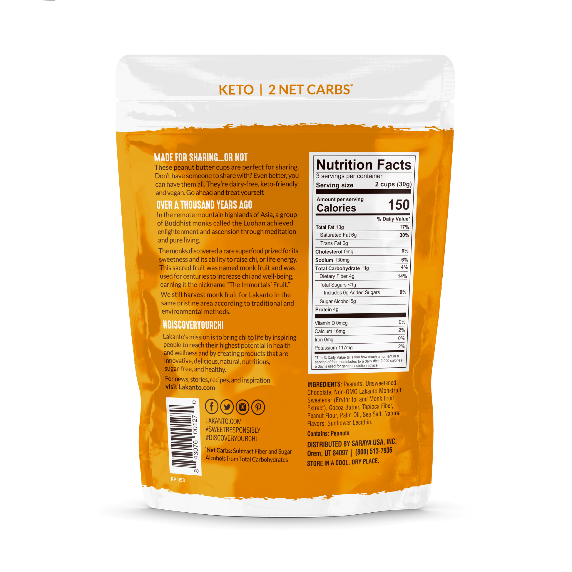 Peanuts, Unsweetened Chocolate, Non-GMO Lakanto Monkfruit Sweetener (Erythritol and Monk Fruit Extract), Cocoa Butter, Tapioca Fiber, Peanut Flour, Palm Oil, Sea Salt, Natural Flavors, Sunflower Lecithin. *Contains: Peanuts.