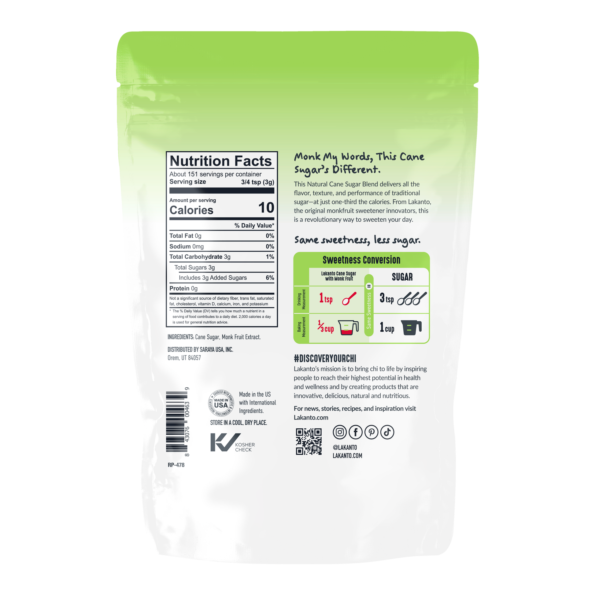 Lakanto Cane Sugar with Monk Fruit is designed for people who want to enjoy real sugar flavor without the full sugar load. By combining traditional cane sugar with monk fruit — a zero-calorie, plant-based sweetener — this blend delivers a brighter, cleaner sweetness while dramatically reducing total sugar and calories.